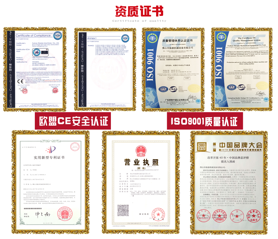 佛山市振嘉機(jī)械設(shè)備有限公司銷售熱線0757-85560891轉(zhuǎn)815(13318387046馬小姐),是一家專業(yè)從事高周波機(jī)、高頻機(jī)、吸塑包裝機(jī),全自動(dòng)高頻機(jī)、超聲波焊接機(jī)、自動(dòng)化高周波機(jī)研發(fā)、制造、銷售、售后為一體的知名生產(chǎn)廠家,我司是一家從事機(jī)械行業(yè)有十幾年的老品牌,注冊(cè)的商標(biāo)為“振嘉”,高周波設(shè)備遠(yuǎn)銷東南亞、中東、歐美、尼泊爾等國家及地區(qū),先后在中國佛山、中山、重慶、武漢等城市,設(shè)立了銷售部及技術(shù)服務(wù)部,,并在全國各地有專業(yè)的維修合作商,能夠更好的服務(wù)全國各地的客戶,配套設(shè)有產(chǎn)品展示廳,模具廠房(如:高周波模具,吸塑電木模,超聲波模具),技術(shù)工程師等以滿足用戶售前打板等,售后上門維修高周波機(jī)等服務(wù),我司的機(jī)器通過歐盟CE出口質(zhì)量認(rèn)證(見下圖),歡迎咨詢和洽談。