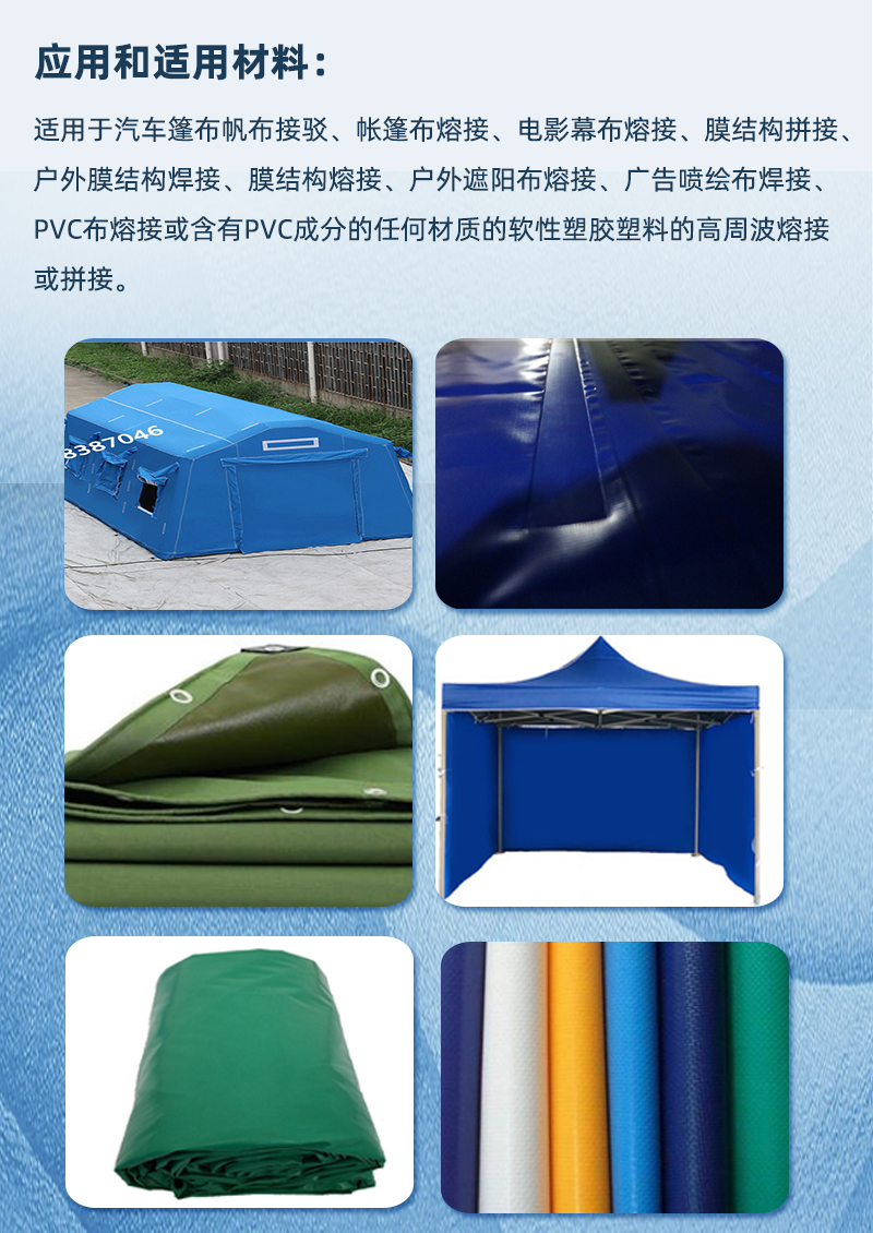 適用于汽車篷布帆布接駁、帳篷布熔接、電影幕布熔接、膜結(jié)構(gòu)拼接、戶外膜結(jié)構(gòu)焊接、膜結(jié)構(gòu)熔接、戶外遮陽布熔接、廣告噴繪布焊接、PVC布熔接或含有PVC成分的任何材質(zhì)的軟性塑膠塑料的高周波熔接或拼接。通過高周波原理熔接后,被高周波熔接的材料,表面光滑平整且美觀牢固。