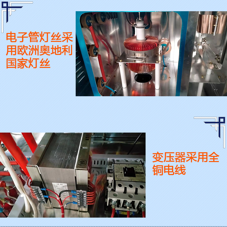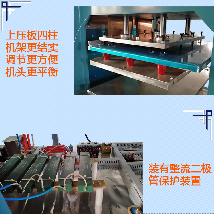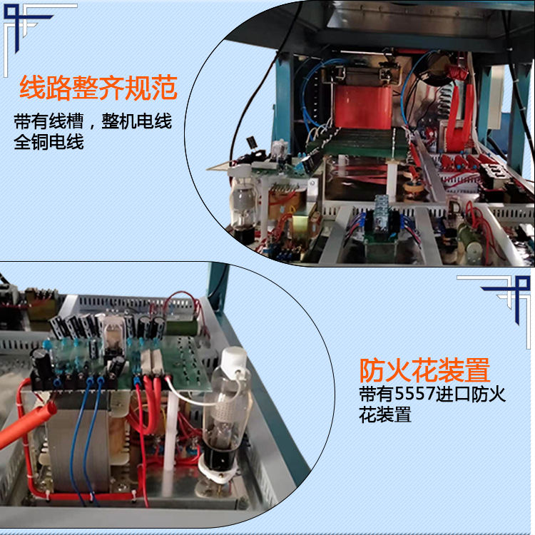 6、大型高周波塑膠熔接機裝有超高速、高靈敏火花保護(hù)電子系統(tǒng),當(dāng)火花產(chǎn)生時,回路能切斷高周波壓制火花,可極安全地保護(hù)模具和物料,并自動示警。