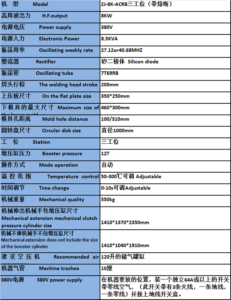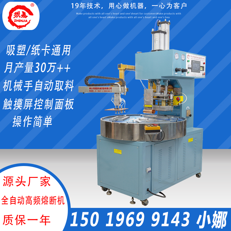 全自動高頻熔斷機(jī)型號為ZJ-8K-ADRB3,是一款三工位圓盤轉(zhuǎn)的環(huán)保材料吸塑包裝機(jī),可以單人操作,節(jié)約人工;全自動帶熔斷吸塑包裝機(jī)由振嘉機(jī)械設(shè)備有限公司環(huán)保材料吸塑包裝機(jī)生產(chǎn)廠家專業(yè)制造,機(jī)器質(zhì)量已通過歐盟CE質(zhì)量出口檢測;環(huán)保材料吸塑包裝機(jī)以自動轉(zhuǎn)盤方式操作。