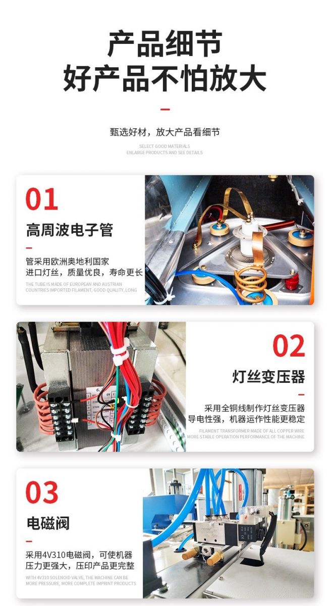 適用于軟膜天花焊接、服裝皮革壓花、玩具拍拍圈熔接成型、PVC醫(yī)用識別帶成型機、PVC與網(wǎng)布熔接成型、PVC軟膠軟膜、包裝袋、名片冊 、PVC吸塑膠盒硬片等,加工包裝熱壓電壓成型。倆人雙頭操作,輔助手工作業(yè) ,針對難對位產(chǎn)品。視線開闊,簡單方便,投入少效率高,是一款經(jīng)濟、簡易型設備。