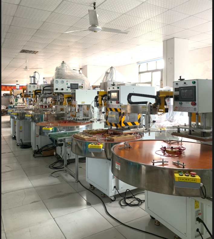 ②、機(jī)械手自動(dòng)取料, 機(jī)械手自動(dòng)取料可以解決壓好的工件由于溫度還未散熱,如果人手取料會在拿取工件邊的時(shí)候由于工件邊緣剛熱合完還沒完全冷卻受力拉扯就會彎或變形,影響了產(chǎn)品的美觀,機(jī)械手采用平行式真空吸盤取料,熔接邊平整不彎,提升質(zhì)與量的效果。