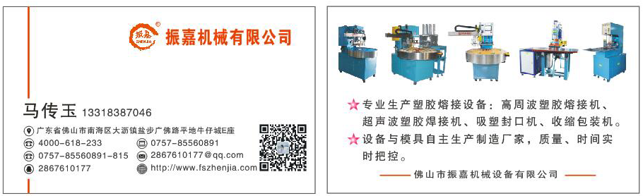 佛山市振嘉機(jī)械設(shè)備有限公司:22年專業(yè)從事高周波機(jī)、高周波同步熔斷機(jī)、高周波塑膠熔接機(jī)、高周波熱合機(jī)、全自動(dòng)吸塑包裝機(jī)、高周波焊接機(jī),高周波封口機(jī),高周波模具,高頻機(jī),吸塑封口機(jī)的設(shè)備研發(fā)、制造、銷售、售后為一體的知名生產(chǎn)廠家! 我司是一家從事高周波設(shè)備行業(yè)有十幾年的老品牌,注冊(cè)的商標(biāo)為“振嘉”,高周波設(shè)備遠(yuǎn)銷東南亞、中東、歐美、尼泊爾等國家及地區(qū),機(jī)器通過歐盟CE出口質(zhì)量認(rèn)證! 振嘉先后在中國佛山、中山、重慶、武漢等城市,設(shè)立了銷售部及技術(shù)服務(wù)部,,并在全國各地有專業(yè)的維修合作商,能夠更好的服務(wù)全國各地的客戶,配套設(shè)有產(chǎn)品展示廳,模具廠房(如:高周波模具,吸塑電木模,超聲波模具)