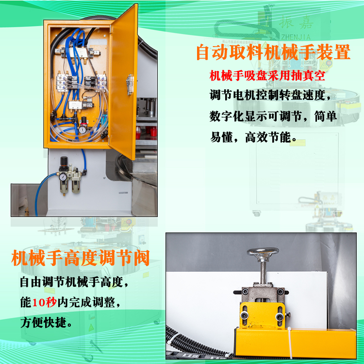 全機均為PLC觸摸屏控制,全自動化帶有抽真空機械手取料(避免手工取料時熔接邊變形),操作簡單,大大減低操作勞動強度和節(jié)省工人,提高效率的同時提升產品檔次