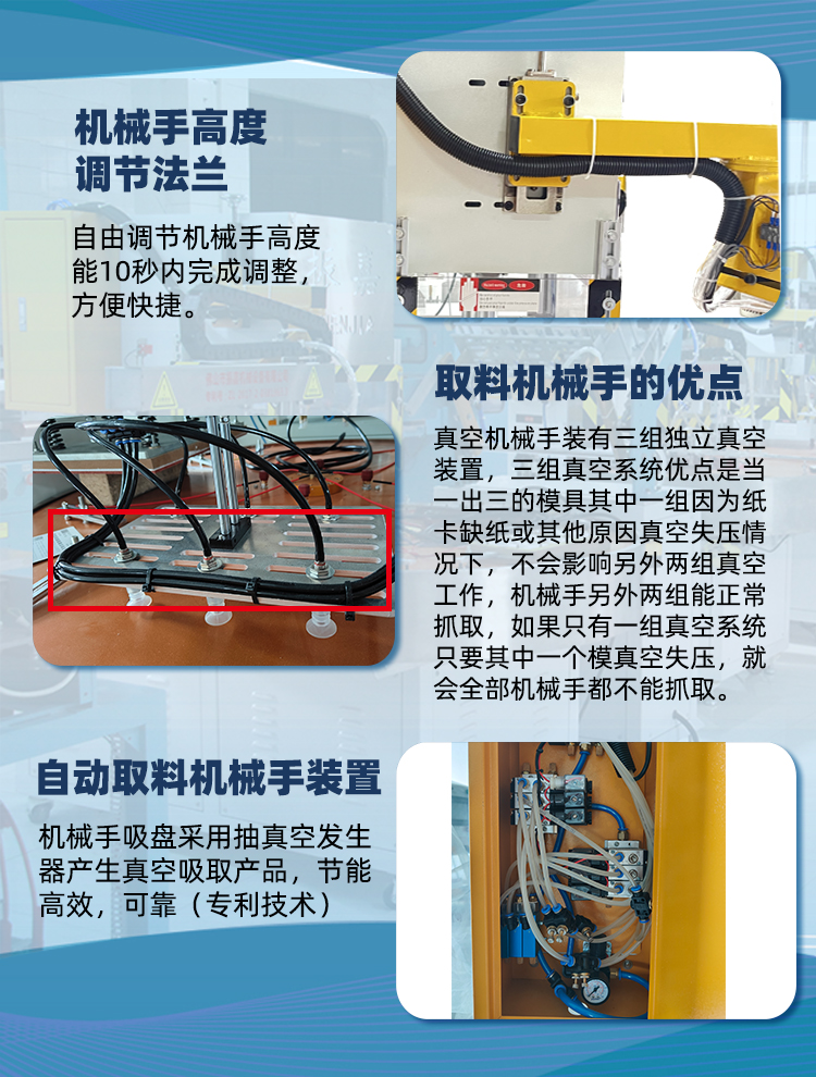 ③機器真空機械手裝有三組獨立真空裝置,三組真空系統(tǒng)優(yōu)點是當(dāng)一出三的模具其中一組因為紙卡缺紙或其他原因真空失壓情況下,不會影響另外兩組真空工作,機械手另外兩組能正常抓取,如果只有一組真空系統(tǒng)只要其中一個模真空失壓,就會全部機械手都不能抓取。