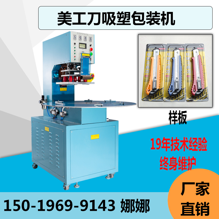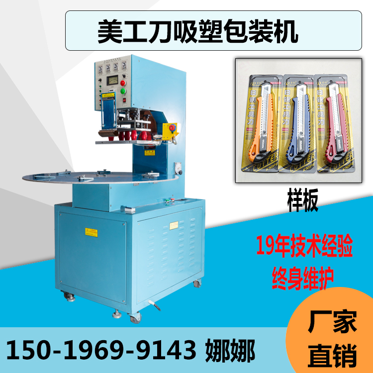 美工刀吸塑包裝機由人工推到轉(zhuǎn)盤,到機頭位置,機器感應(yīng)到,機頭自動下降,在壓的同時,工人可以在機器的例外一邊放產(chǎn)品,產(chǎn)品壓好機頭自動上升,人工把轉(zhuǎn)盤轉(zhuǎn)出來。