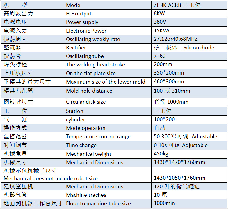 雙面吸塑包裝機(jī)型號(hào):ZJ-8K-ACRB,此機(jī)裝有高敏度5557防火花保護(hù)裝置,對(duì)高周波模具及生產(chǎn)產(chǎn)品起到很大的保護(hù)作用,是一款兩邊滑臺(tái)高周波機(jī),可以單人操作,節(jié)約人工;由振嘉機(jī)械設(shè)備有限公司高周波生產(chǎn)廠家專(zhuān)業(yè)制造,機(jī)器質(zhì)量已通過(guò)歐盟CE質(zhì)量出口檢測(cè),ISO9001機(jī)器質(zhì)量檢測(cè);并對(duì)客戶(hù)的樣板提供免費(fèi)打板打樣,傳授產(chǎn)品生產(chǎn)整過(guò)程工序及提供生產(chǎn)方案。