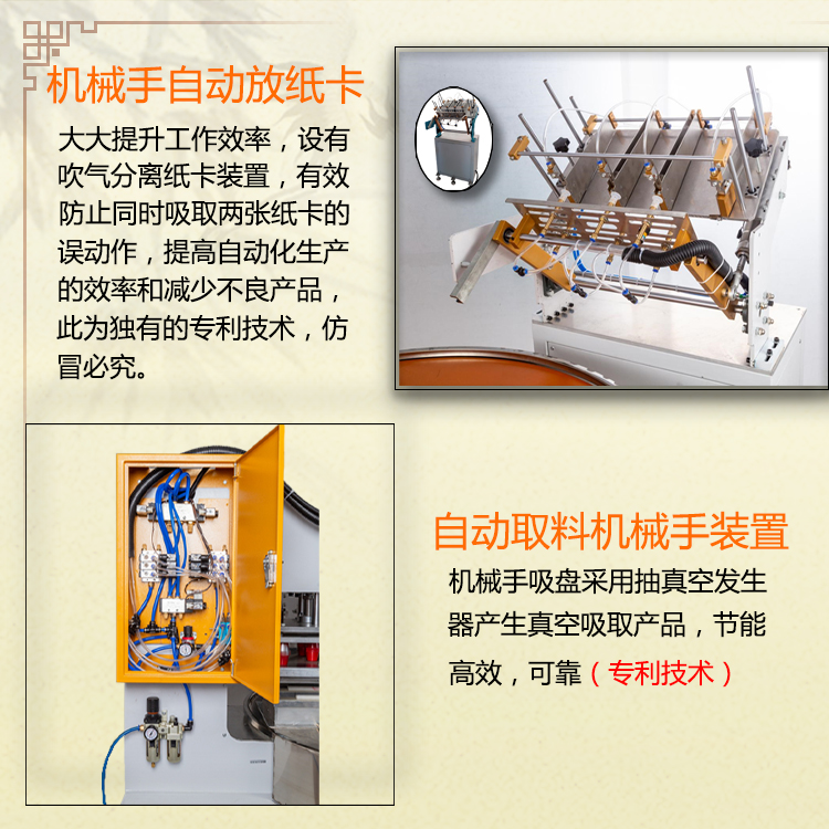 五金配件吸塑包裝機此機只需要一個工人操作,而且只重復(fù)做一個動作就可以,避免工人出錯,工人包裝時只需要把吸塑和包裝的物品放在模具上,取紙卡機械手自動把紙卡放在模具內(nèi),壓合好后取料機械手會自動把壓合包裝好的產(chǎn)品取出來,節(jié)省了一個放紙卡和取料工人,不像傳統(tǒng)的鏈條式吸塑封口機要做12套模具從而增加了模具成本