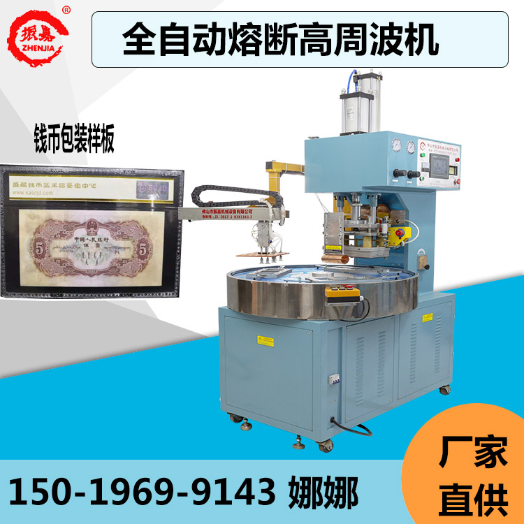 錢幣全自動(dòng)熔斷吸塑包裝機(jī)型號(hào):ZJ-8K-ACRB,此機(jī)裝有高敏度5557防火花保護(hù)裝置,對(duì)高周波模具及生產(chǎn)產(chǎn)品起到很大的保護(hù)作用,是一款自動(dòng)轉(zhuǎn)盤高周波機(jī),可以單人操作,節(jié)約人工;由振嘉機(jī)械設(shè)備有限公司高周波生產(chǎn)廠家專業(yè)制造,機(jī)器質(zhì)量已通過歐盟CE質(zhì)量出口檢測(cè),ISO9001機(jī)器質(zhì)量檢測(cè);并對(duì)客戶的樣板提供免費(fèi)打板打樣,傳授產(chǎn)品生產(chǎn)整過程工序及提供生產(chǎn)方案。